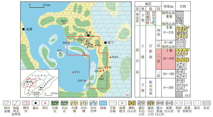 1 地质概况四川盆地属于“扬子准地台”上的一个次级构造单元,是在上扬子克拉通基础上发展起来的大型多旋回叠合盆地[21],盆地基底为中元古纪末晋宁运动形成的褶皱基底[22]。该盆地可划分为5个主要构造单元:川北低缓带、川西低陡带、川中古隆起平缓带、川南低陡穹形带和川东南高陡褶皱带[23],灯影组为区域拉张背景下的碳酸盐岩台地沉积环境[24]。川中蓬莱—高磨地区位于现今古构造分区中的川中古隆起平缓带(图 1a)。四川盆地灯影组自下而上可划分为灯一段、灯二段、灯三段和灯四段[25]。灯一段是在陡山沱期构造-沉积的基础上演化和发展的,继南沱组冰川消融后的又一次海侵退积式沉积的开始;灯二段沉积格局继承灯一段的古地理展布特征,沉积前中期仍为盆地内部宽缓古隆起上的填平补齐沉积充填,后期受桐湾运动Ⅰ幕影响,顶部与灯三段呈不整合接触;灯三段以快速海侵后的低能沉积与混积为主,部分地区发育灰岩及白云岩;灯四段以白云岩沉积为主,受桐湾Ⅱ幕影响,顶部与寒武系呈不整合接触(图 1b)。研究区灯二段主要发育泥—粉晶白云岩、泡沫绵层白云岩、叠层石白云岩、凝块石白云岩、砂屑白云岩、鲕粒白云岩、岩溶角砾白云岩等岩石类型[26],以往观点认为主要为微生物白云岩[27],颗粒白云岩发育占比较少,从而认为灯二段沉积的丘滩复合体多以微生物丘为主。受高频海平面升降影响,在灯二段地层内部可识别出多个米级旋回,在大气淡水的影响下,旋回顶部或可见少量岩溶角砾白云岩[28]。