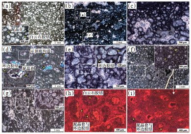 在阴极发光下也能清晰识别泡沫体结构,单偏光下的亮色白云石胶结物与暗色泥晶套(图 2f,2g)在阴极发光下发光性有明显区别。泡沫体内部的部分亮晶白云石在阴极发光下发光性较差,基本不发光(图 2h),大部分亮晶白云石发橙红色光(图 2i),泥晶套与环边胶结发暗红色光。