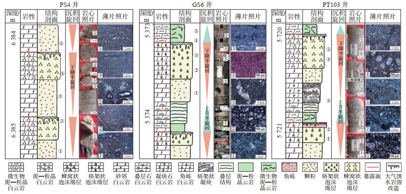 泡沫绵层白云岩出现的沉积序列主要有“颗粒白云岩—泡沫绵层白云岩(PS4井)”、“(微生物)泥—粉晶白云岩—叠层石白云岩—颗粒白云岩—泡沫绵层白云岩(GS6井)”、“(微生物)泥—粉晶白云岩—叠层石白云岩—凝块石白云岩—颗粒白云岩—泡沫绵层白云岩—岩溶角砾白云岩(PT103井)”3种类型(图 3)。从序列上不难看出,泡沫绵层白云岩普遍发育在旋回顶部或上部,厚度为20~50 cm,下部总与颗粒白云岩相邻,其次为微生物岩类,泥—粉晶白云岩通常发育在旋回底部,为海平面快速上升之后下一个旋回初期的低能沉积,在单个米级旋回中,基本只发育单类型泡沫绵层白云岩,但在单口井中的多个米级旋回则可发育2种泡沫绵层白云岩,如PT103井,由于受程度较大的岩溶影响,在格架状泡沫绵层白云岩的上部发育一套薄层岩溶角砾云岩。