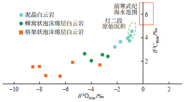 测试结果表明,所选样品稳定同位素值均小于Fairchild等所测定的范围,δ18O值最小为-8.5‰,最大为-1.3‰,δ13C值最小为0.7‰,最大为2.8‰。其中泥晶白云岩δ13C值最小为3.2‰,最大为4.6‰,蜂窝状泡沫绵层白云岩δ13C值最小为2.4‰,最大为2.8‰,格架状泡沫绵层白云岩δ13C值最小为0.7‰,最大为1.9‰;泥晶白云岩δ18O值最小为-2.2‰,最大为-0.9‰,蜂窝状泡沫绵层白云岩δ18O值最小为-4.5‰,最大为-1.3‰,格架状泡沫绵层白云岩δ8O值最小为-8.5‰,最大为-3.4‰。由图 4可以看出,测试样品中泥晶白云岩碳-氧同位素值整体接近灯二段原始沉积物的碳-氧同位素范围,证明了数据的有效性;其次,泥晶白云岩、蜂窝状泡沫绵层白云岩、格架状泡沫绵层白云岩3类样品δ18O与δ13C值均呈逐级减少的特征。