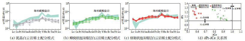 稀土元素主要通过交代碳酸盐矿物的Ca2+进入碳酸盐格架,所以沉积碳酸盐(岩)的稀土元素特征能够很好的指示沉积流体来源和古环境。图 5展示了研究区2种类型泡沫绵层白云岩与泥晶白云岩标准化之后的稀土元素特征,从曲线配分模式来看,泥晶白云岩与2类泡沫绵层白云岩整体符合海相碳酸盐(岩)的特征[33],泥晶白云岩与蜂窝状泡沫绵层白云岩表现为轻稀土元素(LREE)(La,Ce,Pr,Nd)亏损、重稀土元素(HREE)(Ho,Er,Tm,Yb,Lu)略微富集的左倾型配分模式(图 5a,5b),格架状泡沫绵层也具有相似的REE配分模式,但与前两者相比,后者的REE配分形态具有更加水平的趋势(图 5c),即LREE/HREE较高(泥晶白云岩LREE/HREE平均为6.65,蜂窝状泡沫绵层LREE/HREE平均为5.33,格架状泡沫绵层LREE/HREE平均为9.96,表 1)。泥晶白云岩的∑REE值为0.36~1.02,平均为0.81;蜂窝状泡沫绵层白云岩的∑REE值为1.02~1.86,平均为1.43;格架状泡沫绵层白云岩的∑REE值为2.33~3.21,平均为2.73,三者REE含量呈逐级递增的特征。此外,泥晶白云岩、蜂窝状泡沫绵层白云且δCe平均值呈逐级递减趋势(分别为0.89,0.85,0.58),考虑到La异常可能对Ce异常响应造成影响,通过δCe与δPr相结合对Ce异常进行了判别[34],从图 5d可以看出,泥晶白云岩、蜂窝状泡沫绵层白云岩与格架状泡沫绵层白云岩所有样品点均落在δCe<1和δPr>1的区域内。