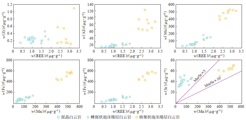 在成岩作用过程中,碎屑中的稀土元素可被释放并转移到碳酸盐相,因此Fe,Al,Zr,Mn等元素的含量可以反映陆源对沉积物的影响程度[35-36]。泥晶白云岩、蜂窝状泡沫绵层白云岩、格架状泡沫绵层白云岩的Fe,Al,Mn含量与总稀土(REE)均呈正相关关系,格架状泡沫绵层白云岩的Fe,Al,Mn,Zr含量最高,相应的REE含量也最高,其次为蜂窝状泡沫绵层白云岩,含量最低的为泥晶白云岩(图 6)。