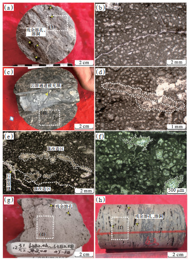 首先,通过镜下观察,泡沫绵层白云岩中可识别出大量椭圆状泡沫体,形状类似颗粒,同时泡沫体的泥晶套外壁可识别出薄层环边胶结,说明泡沫体原岩为颗粒,粒间孔隙为环边胶结物的发育提供了空间,泡沫体内部的亮色白云石胶结物为粒内溶孔或铸模孔被后期胶结充填形成;其次,从泡沫绵层白云岩沉积序列可以看出,泡沫绵层白云岩普遍发育在受海平面升降控制的高频旋回顶部或上部,下部普遍发育颗粒岩,说明岩溶类型为准同生期岩溶,顶部或上部更强程度的溶蚀形成了铸模孔与粒内溶孔[37-38]。与此同时,格架状泡沫绵层白云岩中,泡沫体多数发生变形,只有少数维持椭圆状,且泡沫体间的胶结物数量较多,体积更大,格架状泡沫绵层白云岩在宏观上,残余溶孔或溶洞数量明显多于蜂窝状泡沫绵层白云岩,同时可见岩溶渗流通道被充填,说明其岩溶改造程度明显大于蜂窝状泡沫绵层白云岩(图 7)。说明不同旋回的不同岩溶强度在一定程度上决定了泡沫绵层类型的发育,在岩溶强度相对较大的旋回中上部,发育格架状泡沫绵层白云岩,反之,则发育蜂窝状泡沫绵层白云岩。