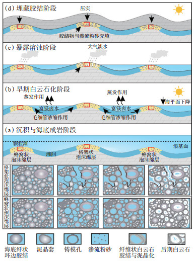 4.2 成岩演化模式泡沫绵层白云岩的成岩演化主要可以分成4个阶段(图 8)。①颗粒岩沉积与海底成岩阶段:四川盆地灯二段颗粒岩主要是鲕粒与黏结砂屑,颗粒岩沉积初期的海底成岩环境,粒间仍存在大量孔隙,微生物附着在颗粒表面,对颗粒钻孔导致颗粒外围发育颜色较暗的一层泥晶套,在泥晶套外壁发育纤状环边胶结物。②早期白云石化阶段:在颗粒滩的生长建造过程中,海平面下降导致滩体之间海水被围限,蒸发作用会增大局限海水的盐度,使Mg2+浓度过饱和得以析出,与此同时,粒间水的盐度升高会导致毛细管浓缩作用,从而发生白云石化。③早成岩期岩溶改造阶段:颗粒滩的持续建隆与海平面下降导致滩体暴露,在大气淡水淋滤下,颗粒滩会经历不同程度的岩溶改造,不饱和的岩溶水会优先溶蚀颗粒内部,发生颗粒的选择性溶蚀,从而形成粒内溶孔或铸模孔,粒间也会发生少量溶蚀形成粒间孔。随着岩溶作用的持续,岩溶水形成优势岩溶通道,导致溶缝溶沟、溶洞的形成,伴随有白云石渗流粉砂充填,且出现明显的岩溶分带。④埋藏胶结阶段:在埋藏早期阶段,沉积物中饱和的海水在早成岩期岩溶作用下形成的粒内溶孔中发育纤维状或柱状等厚的粒内环边胶结;持续埋藏过程中,随上覆地层压力的增大,颗粒形状及颗粒间接触方式也会发生变化,沉积期似圆形的颗粒会普遍呈不规则状,而沉积期颗粒间普遍的点接触会逐渐转变为线面接触,同时粒间孔隙会被后期白云石进一步充填。