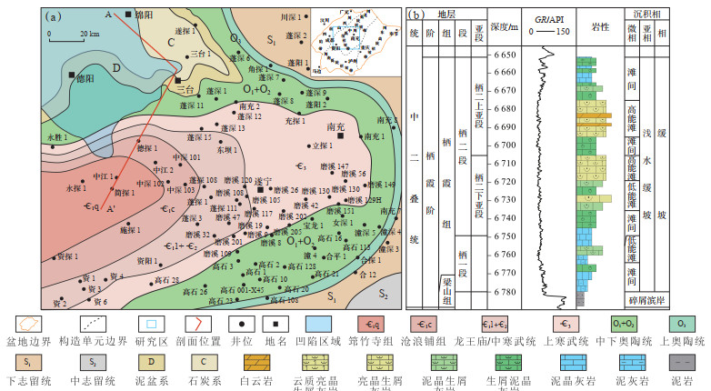 1 地质概况四川盆地在大地构造上属于上扬子地台,按地理—构造属性可划分为川西山前凹陷带、川北低陡褶皱带、川中低缓褶皱带、川南低陡褶皱带及川东高陡褶皱带等5个构造带[8]。研究区大地构造位置主要位于川中低缓褶皱带,北起绵阳、南抵资阳、西至德阳、东达南充。晚寒武世—早奥陶世,华南板块与冈瓦纳大陆汇聚碰撞产生的区域挤压应力使四川盆地内部形成一系列同生挤压凹陷,研究区“德阳—绵阳”凹陷即为其中之一[12]。志留纪末期的广西运动、泥盆纪末期的柳江运动和石炭纪末期的云南运动导致研究区沉积基底持续抬升暴露并遭受差异剥蚀,使二叠系沉积前地貌转变为局部地貌隆坳起伏的准平原化格局(图 1a),为早二叠世的广泛海侵创造了条件[13-15]。二叠纪初期,伴随全球范围内的冰期结束和普遍的冰川消融,扬子区域经历了晚古生代最广泛的一次海侵作用[16],在石炭系—寒武系等不同时代地层的不整合面之上依次发育梁山组、栖霞组和茅口组[12],其中栖霞组归属中二叠统栖霞阶(图 1b)。