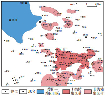 依照优势相带控储的勘探思路,结合高能颗粒滩有利相带分布,对德阳—绵阳凹陷南缘栖霞组有利储集区带进行预测,认为高石梯、磨溪、蓬深15井—蓬深11井—蓬深1井一带和蓬深8井—蓬深7井—蓬深6井—蓬深2井一带等地区为有利储集区带,其中磨溪地区高能滩最为发育,为研究区最有利储集区带(图 10)。研究区北部蓬莱地区,靠近“德阳—绵阳”凹陷周缘的井,如蓬深11、蓬深1以及蓬深6井(参见图 6),颗粒滩相及测井储层响应段发育规模、频率明显高于其他井区,局部甚至与磨溪地区类似,这一趋势意味着“德阳—绵阳”凹陷周缘有利相带及相关储层相对更为发育,尽管当前资料显示似乎未形成典型的镶边台缘,但可能形成弱镶边台缘,抑或由于钻井资料有限的原因认识有待完善,后续应加强凹陷周缘地球物理资料处理与精细刻画预测,“德阳—绵阳”凹陷周缘有望成为下一个规模相控天然气藏勘探区。