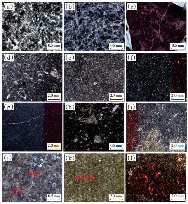 ① 晶粒白云岩。研究区晶粒白云岩主要包括半自形—自形状中—粗晶白云岩和他形镶嵌状细—中晶白云岩。半自形—自形状中—粗晶白云岩的白云石自形程度较好,宏观上呈浅灰色或灰白色,见针状溶孔或溶洞发育。镜下观察以中晶白云石和粗晶白云石为主,见雾心亮边结构,发育晶间(溶)孔。原岩结构普遍被破坏,偶见颗粒幻影轮廓(图 2j)。他形镶嵌状细—中晶白云岩宏观上呈浅灰色,总体较致密,局部见针状溶孔。镜下观察发现,这类白云岩以他形镶嵌状为特征,通过对原岩结构进行恢复,可见颗粒幻影结构(图 2k)。该岩石类型主要发育于栖二段,栖一段偶见发育。②灰质白云岩。通常是白云石化作用不完全的产物,结合显微镜下观察发现以自形—半自形粉—细晶白云岩为主,局部见残余生物碎屑颗粒。发育晶间(溶)孔且多被暗色的泥质、有机质等充填(图 2k,2l)。该岩石类型主要发育于栖二段,栖一段偶见发育。