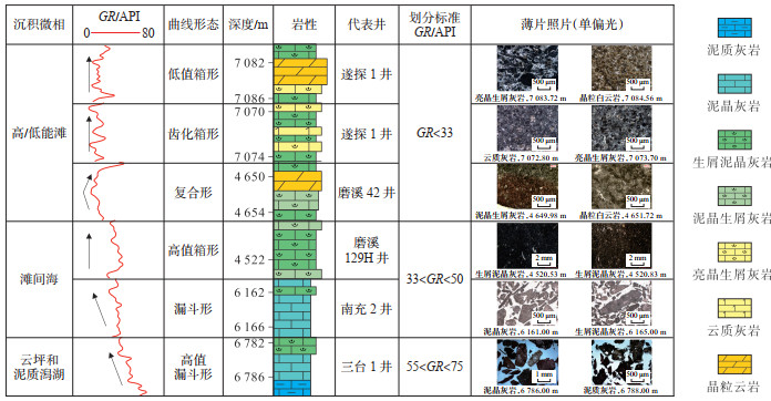 2 沉积标志识别与类型划分 2.1 岩相标志基于以往对整个四川盆地栖霞组沉积特征研究认识及研究区大量岩心与岩屑镜下薄片的观察描述[6-7],结合典型碳酸盐岩分类方案,将研究区岩石类型划分为灰岩和白云岩两大类,其中灰岩类又可进一步划分为亮晶生屑灰岩、泥晶生屑灰岩、生屑泥晶灰岩、泥晶灰岩、泥质灰岩和云质灰岩等六小类,白云岩类可划分为晶粒白云岩和灰质白云岩等二小类。