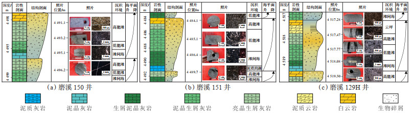 (5)泥质潟湖。在平面上通常处于云坪靠内一侧水体相对较深区域,环境能量低,水体循环往往受到限制,岩石类型组合由暗色泥质灰岩和泥晶灰岩构成。该组合在研究区发育频率较低且规模较小,单层发育厚度较小,一般小于1 m,在纵向上发育于滩间海—低能滩—高能滩—云坪或泥质潟湖的向上变浅旋回顶部(图 4b),是颗粒滩迁移叠置过程中因局部被障壁局限而形成。