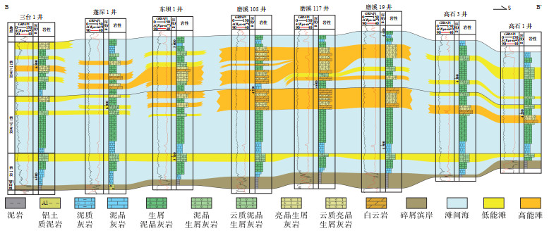 (4)云坪。位于低能浅水环境,岩石类型组合由泥晶灰岩及泥粉晶白云岩组成。该环境水体循环受限、盐度相对较大,以回流渗透作用下形成的大量泥粉晶白云岩为主要特征。该组合在研究区发育频率低且规模较小,多位于高能生屑滩之上,这主要是因为当颗粒滩快速生长至海平面附近时,可容空间变小,颗粒滩将发生侧向迁移,而其顶部则由于能量降低发育台坪沉积,并在垂向上构成滩间海—低能滩—高能滩—云坪的向上变浅旋回(图 4c)。