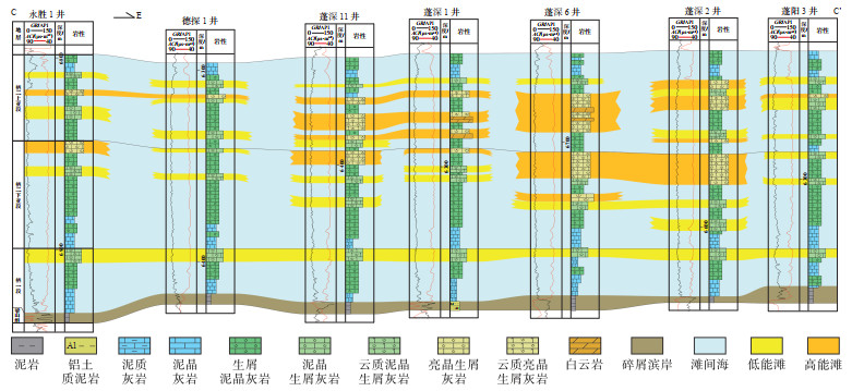 连井剖面显示,四川盆地德阳—绵阳凹陷南缘栖霞组分布稳定,厚度变化不大。自北向南沉积相连井对比剖面(三台1井—蓬深1井—东坝1井—磨溪108井—磨溪117井—磨溪19井—高石3井—高石1井)(图 6)显示,梁山组—栖一段沉积期,颗粒滩相对欠发育,仅晚期发育薄层低能滩,且横向分布稳定;栖二下亚段沉积期,自下而上可识别出2套滩体,第1套颗粒滩主要分布于高石梯、磨溪地区,蓬莱地区偶见发育,第2套颗粒滩主要分布于磨溪、蓬莱地区,高石梯地区几乎不发育,颗粒滩具有自南向北逐渐迁移的特征;栖二上亚段沉积期,颗粒滩在磨溪地区继承性发育的基础上,向北部继续迁移,蓬莱地区颗粒滩发育频率明显增加(图 6)。自西向东沉积相连井对比剖面(永胜1井—德探1井—蓬深11井—蓬深1井—蓬深6井—蓬深2井—蓬阳3井)(图 7)显示,蓬莱地区颗粒滩主要发育于栖二下亚段顶部及栖二上亚段,进一步表明栖霞组早期至晚期,研究区颗粒滩具有自南向北逐渐迁移的特征。