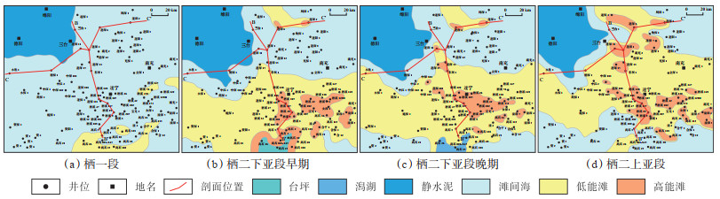 (2)栖二下亚段。其沉积期基本继承了栖一段的沉积格局,但颗粒滩分布面积明显增大。栖二下亚段主要发育低能滩、高能滩、滩间海、云坪、潟湖及静水泥等沉积,其中滩间海主要分布于蓬莱地区,静水泥分布于德阳—绵阳地区。栖二下亚段沉积早期,颗粒滩主要在研究区南部大面积分布,北部的蓬深6井—蓬深2井区亦有分布,其中高能滩主要分布于高石梯、磨溪地区,北部呈零散分布。此外,高石梯以南地区主要发育云坪沉积(图 8b)。栖二下亚段沉积晚期颗粒滩分布与早期滩分布格局具有继承性,但高能滩范围略有缩小。高石梯以南地区主要发育泥质潟湖沉积(图 8c)。相比于早期高能滩,研究区南部颗粒滩相对欠发育,而蓬莱地区颗粒滩较发育,表明颗粒滩明显具有自南向北逐渐迁移的特征。总体而言,栖二下亚段沉积期高能颗粒滩在高石梯、磨溪地区最为发育,蓬莱地区次之。颗粒滩整体具有自南向北逐渐迁移的特征。