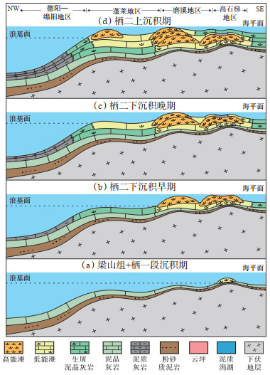 3.3 沉积演化模式研究区栖霞组沉积相带展布格局很大程度上受古地貌控制,而颗粒滩的发育则主要受沉积微地貌与相对海平面升降共同约束。梁山组—栖一段沉积时期,沉积环境主要受控于云南运动所形成的侵蚀古地貌和早二叠世海平面相对升降变化[13, 19]。二叠系沉积前,研究区地貌特征主要表现为南高北低,即高石梯地区最高、磨溪地区次之,蓬莱地区最低。随着早二叠世早期海侵,栖一段具有由地貌低地向地貌高地逐层超覆的特征[19-20],岩性由早期的粉砂质泥岩逐渐过渡为中晚期的泥晶灰岩、泥质灰岩,颗粒滩整体欠发育,晚期在地貌较高的高石梯地区见薄层泥晶生屑灰岩(图 9a)。栖二下亚段沉积早期,相对海平面略微降低,高石梯地区因微地貌最高,水体较浅,沉积环境能量相对最高,优先发育以亮晶生屑灰岩为主的高能颗粒滩,随着滩体生长与可容纳空间的不足,在地貌相对最高的滩核区域逐渐形成低能的云坪沉积,而在滩缘及其周缘区域则发生滩体的侧向迁移生长,这是由于随着沉积物的不断堆积,导致原地貌相对较低的磨溪地区沉积基底逐渐高于浪基面,开始发育颗粒滩沉积;不仅如此,由于磨溪更靠近广海,相较于高石梯具有更深的浪基面与波浪作用,导致磨溪地区滩体规模逐渐超过高石梯,减小了高石梯和磨溪地区之间的地貌差异(图 9b)。到了栖二下亚段晚期,高能颗粒滩在磨溪地区继承性发育,并形成障壁体系,使沉积地貌发生反转,即磨溪地区地貌逐渐高于高石梯地区,高石梯地区水体相对受限,从而发育泥质潟湖沉积环境;与此同时,磨溪地区的颗粒滩持续向蓬莱地区迁移。但由于该时期蓬莱地区水体总体相对较深,仅局部微古地貌高地发育薄层滩体(图 9c)。栖二上亚段沉积期,滩体在磨溪地区持续垂向加积的同时,进一步向蓬莱地区迁移,由于此时蓬莱相较于磨溪更靠近广海,导致该阶段蓬莱地区颗粒滩发育规模逐渐超过磨溪地区,进一步减小了蓬莱地区与磨溪、高石梯地区之间的地貌差异(图 9d)。