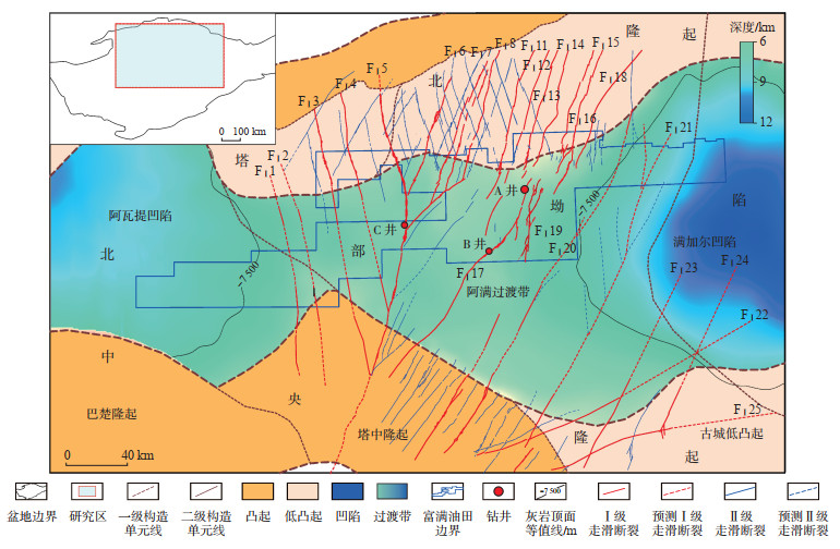 塔里木盆地是中国最大的海相碳酸盐岩含油气盆地,其勘探过程历经50多年[1-2],早期石油勘探主要集中在盆地边缘和内部的逆冲推覆带,如库车前陆盆地和塔中隆起[3-5]。自2010年以来,依托高精度三维地震资料,在塔北隆起和阿满过渡带发现了一系列大型走滑断裂带[6-8],随后中石油塔里木油田和中石化西北局在塔河、富满以及顺北油田围绕着走滑断裂带的油气勘探取得了重大突破[9-11],揭示了走滑断层对超深层碳酸盐岩油气藏具有明显的控制作用,目前走滑断控油藏是塔里木盆地勘探的主要领域[1]。富满油田位于阿满过渡带,相较于研究成熟的塔北和塔中隆起,研究区储层受岩溶作用的影响小[12],走滑断层通过其独特的力学作用和流体性质对研究区储层的发育起主导作用[10, 13]。众多学者对阿满过渡带走滑断裂的构造样式、演化期次以及形成机制进行了大量研究,总结出走滑断裂纵向分层、平面分段、多期活动的发育特征[14-16],总体认为走滑断裂形成于中晚奥陶世[17-18]。走滑断裂控储作用的研究表明走滑断层破碎带发育的裂缝和空腔等是致密碳酸盐岩的储集空间[19-21],通过断层运移的流体对储层进行改造[22-23]。走滑断裂破碎带结构复杂,不同应力分段的破碎带结构存在明显差异,破碎带的结构决定了储层类型,复杂的破碎带结构导致碳酸盐岩断控储层具有强烈的非均质性[24-26]。大量的研究成果揭示走滑断裂破碎带对油气富集具有明显的控制作用,但是对破碎带结构的研究较少,且现有研究主要是基于野外或者井震资料的独立研究,缺乏野外和井震资料的综合研究。