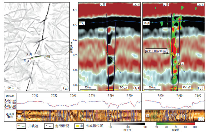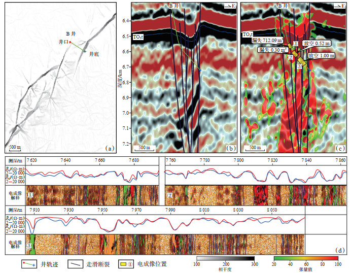 A井位于FⅠ17断裂北部平移段(图 10a),过井地震剖面可见该井钻穿2条走滑断层,断层控制了串珠状反射,断层活动性低,地层变形弱(图 10b)。结构张量属性叠合地震剖面显示裂缝主要分布在2条断裂周围,且西侧断裂破碎带分布范围更广(图 10c),2条断层组成的破碎带总宽度为352 m,破碎带宽度较小,单条断层的破碎影响范围有限,裂缝仅在断裂两侧较窄范围发育。成像测井解释结果与地震资料结果一致,可见2组破碎带发育(图 10d),深浅侧向测井曲线能够准确地反应裂缝发育位置,2组破碎带之间裂缝不发育。第1组破碎带斜宽为67 m,发育大量低角度裂缝,钻至该断层发生漏失,累计漏失钻井液1 016.98 m3。第2组破碎带斜宽为25 m,发育2组相交的高角度裂缝以及一系列的低角度裂缝,裂缝走向与断裂走向一致。