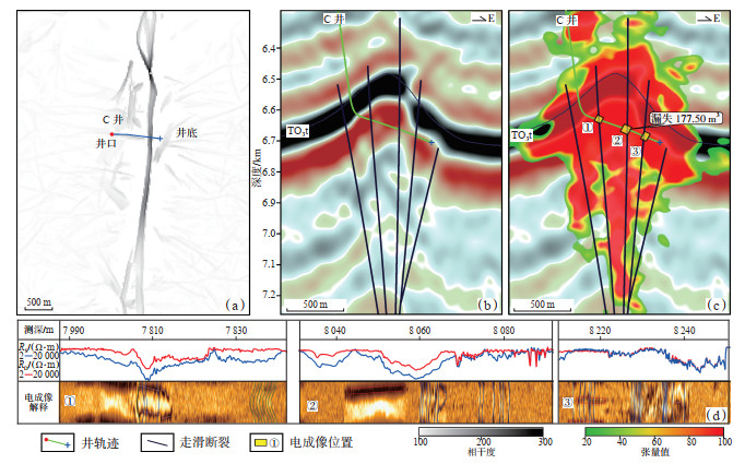 C井位于FⅠ5断裂中部压扭段(图 12a),断层活动性强,灰岩顶面隆起幅度大。地震剖面可见断裂带由5条断层构成,地层强烈挤压变形,使得宽度变大(图 12b,图 12c)。钻井钻遇其中3条断层,并未完全钻穿破碎带。成像测井解释中可见3组破碎带发育(图 12d),一共钻遇3条断裂,第1组破碎带中部发育1条断裂,裂缝密集发育,破碎带斜长为42 m。第2组破碎带中发育1条断裂,核部发生漏失,共漏失177.50 m3,破碎带斜长为60 m。第3组破碎带斜长为41 m,由1条断层控制发育,断层核部溶蚀孔洞发育。结构张量剖面显示裂缝孔洞广泛发育,断裂带两侧发育,破碎带结构张量宽度为1 148 m(图 12c),远大于平移段破碎带,略大于张扭段,且单条断层破碎带宽度也大于断层平移段破碎带,但小于张扭段破碎带。