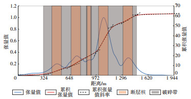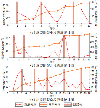 皮羌断裂中段的露头特征与裂缝统计数据揭示了其复杂的破碎带结构。如图 8所示,破碎程度各异,不同类型的破碎带结构相互交织、反复出现。即便是同类型的破碎带,由于强度差异,裂缝的发育程度也显著不同。露头统计结果得到的裂缝密度曲线呈现多峰的特征(图 9a),与单核破碎带常见的由断层核向两侧递减的趋势截然不同。皮羌断裂的断面并不明显,使得断层的精确位置难以辨识。为了更深入地研究,借鉴以往学者的研究方法[36]对裂缝的累积密度进行了统计。结果显示,裂缝累计密度曲线中存在多个斜率变化的区域。通常情况下,单核破碎带裂缝密度累积曲线的斜率变化处,往往是破碎带与围岩的边界。皮羌断裂带结构复杂,多条断层同时影响,使得各断层之间的围岩界定异常困难。因此,将多核破碎带中的斜率变化点视为断层核的位置,而2核之间的区域则是由2条断裂共同控制的断层裂缝带(图 9)。皮羌断裂中段实际上是由多条断裂组合而成的复合断层破碎带,其结构复杂,碎裂岩段和泥岩段构成了断层核的主要部位,分别是1段、4段和8段,这3条断裂的断层核的宽度相对较小,但破碎程度极高。此外,除了中段的断裂破碎带外,皮羌断裂的北段和南段的破碎带结构也体现出不同类型的破碎带结构,他们相互交织,呈现多核断裂破碎带的特征(图 9b,9c)。综上可知,皮羌断裂整体上是由多条次级断裂共同组成的复杂走滑断裂带。