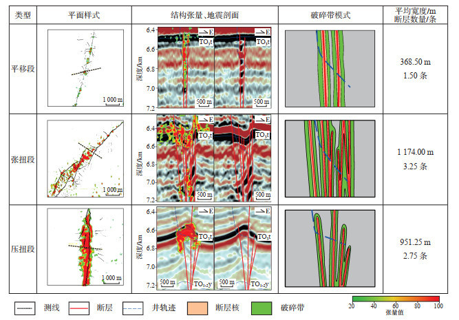 走滑断裂的地震响应特征表明富满油田发育的走滑断裂与皮羌断裂发育模式相同,是多条断裂组合而成的多核断裂破碎带模式,即使位移量较小的平移段断裂也并非由单条断裂控制。并且不同应力机制下的走滑断裂的井震建模结构存在明显差异(图 14),平移段破碎带宽度最小,破碎带主要发育裂缝,且裂缝走向与断裂走向一致。张扭段破碎带受断裂组合影响,破碎带宽大,但是破碎作用主要发生在断裂带内部,对断裂两侧围岩影响较小;张扭段破碎带裂缝和溶蚀孔洞均发育,造成钻井过程中的漏失和放空,发育多组走向裂缝,优势走向与断裂走向高角度相交。压扭段破碎带因复杂的断裂带导致破碎带宽度大,破碎作用不仅在破裂带内部发生,而且对断裂带外围也有一定的影响;压扭段破碎带以裂缝发育为主,溶蚀孔洞欠发育,裂缝走向并无明显优势。
