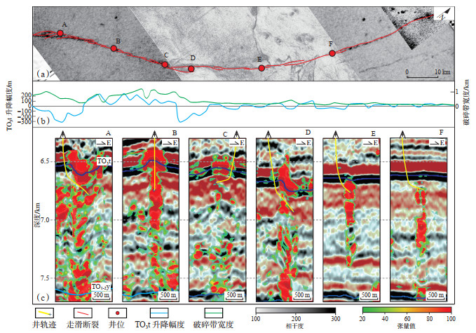 FⅠ17断裂是一条NE向走滑断裂(图 15a),活动性分析揭示该断裂活动具有南强北弱的趋势,破碎带宽度统计结果与活动性趋势相同(图 15b),断裂的活动性强大部位发育规模更大的断层破碎带。不同强度断裂的过井地震—结构张量叠合剖面中,灰岩顶面(TO3t)变形幅度越大则破碎带范围越大,拉张段和挤压段的破碎带宽度普遍大于活动性较小的平移段(图 15c)。断裂破裂作用使得致密碳酸盐岩地层形成规模缝洞型储层。综上分析可知,一般情况下,断裂带规模越大,破碎带越发育,控制的缝洞型储层也更为发育。