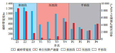 然而实际生产中并非规模大的储集体就一定有较好的产能,前文分析发现不同应力段下破碎带结构存在差异,因此选择富满油田FⅠ17断裂带上不同应力段钻井,对断层破碎带宽度与单井产能进行对比分析,结果显示张扭段单井产能高于压扭段与平移段,压扭段单井产能最低(图 16)。而且张扭段和平移段的单位压降产油量与破碎带宽度存在较好的正相关关系,破碎带宽度越大单位压降产油量越高。压扭段的单井产能和破碎带宽度则没有明显的对应关系,单位压降产能普遍较低,同等规模破碎带的张扭段Z1井与压扭段Y3井的单位压降产油量相差9倍多。以上结果表明,单井产能不仅与破碎带发育规模相关,还与走滑断裂所处应力环境有极大关系,不同应力段的钻井产能揭示张扭段和平移段钻井的产能通常较压扭段钻井高。走滑断裂复杂的破碎带结构产生大量构造裂缝和破碎角砾岩缝网,形成了复合的断裂体缝洞储集空间,张扭段整体处于拉张应力下,裂缝开启度高,储集体连通性高。反观压扭段破碎带,在挤压应力下形成,裂缝开启度低,储集体连通性差,导致产能低。然而并非所有的张扭段都比压扭段单井产能高,例如Z3井和Y4井,可见应力分段也只能作为储集体连通性的参考。综上可知,在以后的勘探中可以将断层破碎带宽度大的张扭段作为主要方向,同时加强储集空间连通性的研究。