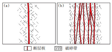 下载原图 图 3 单核断层(a)和多核断层(b)破碎带示意图 Fig. 3 Schematic diagrams of single-core fault(a)and multi-core fault(b)damage zones |