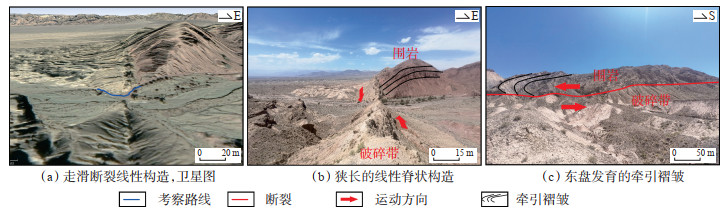 以皮羌断裂中段考察点(坐标N 40.3°,E 77.7°)为例:观测路线如图 5a所示,破碎带宽度约为122 m。卫星图和野外露头均能观察到走滑断裂典型的线性构造识别特征,露头为狭长的线性脊状构造(图 5a,5b),破碎程度高。断层破碎带与围岩可见明显的边界,破碎带为浅色的裂缝发育带,围岩为红色或绿色岩层。考察点北部东盘围岩中发育走滑断裂相关的牵引褶皱,地层变形严重,褶皱方向指示了其所在活动盘的运动方向(图 5c),表明皮羌断裂为左旋走滑断裂。