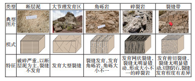 沿破碎带露头对裂缝发育情况进行实地测量,依据破碎带变形程度将断裂破碎带的结构分为断层泥、大节理发育区、角砾岩、碎裂岩和裂缝带等5类。断层泥破碎严重,裂缝不发育;大节理发育区变形程度低,发育大型裂缝;角砾岩带裂缝发育,角砾大小不一;碎裂岩带发育网状裂缝,裂缝无明显错动;裂缝带发育剪切裂缝,裂缝无明显错动,切割岩石,裂缝发育程度有差异(图 6)。