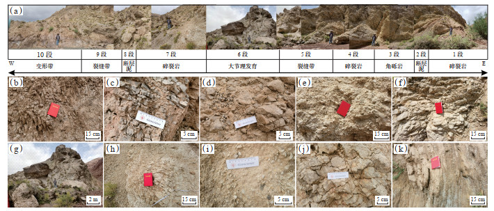 下载原图 图 7 塔里木盆地皮羌断裂中段寒武—奥陶系碳酸盐岩露头分段及各段细节照片 (a)皮羌断裂中段露头分段照片;(b)碎裂岩,1段细节照片;(c)断层泥和角砾岩,2段细节照片;(d)角砾岩,3段细节照片;(e)碎裂岩,4段细节照片;(f)裂缝带,5段细节照片;(g)大节理发育区,6段细节照片;(h)碎裂岩,7段细节照片;(i)断层泥,8段细节照片;(j)裂缝带,9段细节照片;(k)围岩变形带,10段细节照片。 Fig. 7 Segmentation and detailed photos of the Cambrian-Ordovician carbonate outcrops in the middle segment of Piqiang fault, Tarim Basin |