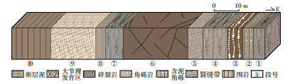 皮羌断裂中段考察点断裂破碎带由东向西划分为10段,各段之间无明显的变化边界(图 7a)。1段破碎程度高,以碎裂岩为主,宽为4.7 m,裂缝总数为170条,裂缝密度约为36.17条/m。2段由断层泥和角砾岩构成,宽为4.3 m,裂缝总数为100条,裂缝密度约为23.26条/m。3段为角砾岩,宽为6.0 m,裂缝总数为83条,裂缝密度约为13.83条/m。4段为碎裂岩,宽为10.0 m,裂缝总数为620条,裂缝密度为62.00条/m。5段为裂缝发育带,破碎强度较高,宽为6.0 m,裂缝总数为200条,裂缝密度约为33.33条/m。6段为大节理发育区,破碎程度低,宽为26.0 m,裂缝总数为200条,裂缝密度约为7.69条/m。7段为碎裂岩,宽为7.0 m,裂缝总数为400条,裂缝密度约为57.14条/m。8段为断层泥,宽为4.0 m,破碎严重,裂缝不发育。9段为裂缝发育带,宽为18.0 m,裂缝总数为800条,裂缝密度约为44.44条/m。10段为围岩变形带,宽为36.0 m,裂缝总数为30条,裂缝密度约为0.83条/m。