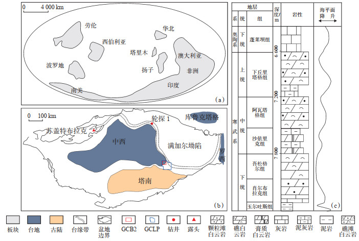 1 地质概况幅员辽阔的塔里木盆地位于塔里木板块之上,历经多期构造运动[13]。盆内蕴含丰富的油气资源,大于8 000 m深层—超深层钻探活动逐年增加,油气储量持续增长[14-16]。早寒武世,塔里木板块与扬子板块毗邻,两者均位于赤道附近(图 1a)[8, 10, 17-18],塔里木盆地与四川盆地分别属于塔里木板块与扬子板块[7, 9]。在前震旦结晶基底之上发育起来的塔里木盆地现今构造包括6个坳陷(库车、阿瓦提、满加尔、唐古、西南与东南)和4个隆起(塔北、塔中、巴楚与塔东)。古城地区属于塔东隆起,构造样式由2个旋回(震旦纪—三叠纪和侏罗纪—第四纪)叠加而成,具体分为震旦纪—奥陶纪的裂谷坳陷、志留纪—中泥盆世的过渡坳陷、晚泥盆世—早二叠世的转化坳陷、晚二叠世—三叠纪的前陆盆地、侏罗纪—白垩纪的断陷坳陷和新生代晚期的前陆盆地6个阶段[19]。早寒武世,塔里木盆地发育库鲁克塔格、罗西和中西三大台地[20]。从早寒武世至中寒武世,塔南古陆持续供给碎屑物质[21-23]。满加尔坳陷是盆地重要的生烃灶,其周边发育碳酸盐岩台缘带[24-25]。古城地区位于塔南古陆、中西台地和满加尔坳陷之间(图 1b),该区展布近北东向的走滑断裂体系。古城地区前寒武纪基底与扬子板块相似[26],基底年龄从南向北逐渐增加,基底之上沉积了震旦系至第四系厚逾万米地层[27]。震旦纪,裂谷坳陷盆地内充填碎屑岩;晚震旦世—早寒武世,以碳酸盐岩为主;中寒武世多为蒸发岩;晚寒武世,碳酸盐岩占优(图 1c)。奥陶纪,沉积碎屑岩和碳酸盐岩;志留纪—泥盆纪,以海相碎屑岩为主;石炭纪,由海相碳酸盐岩过渡为陆相碎屑岩;二叠纪—三叠纪,海、陆相碎屑岩在盆地中形成混积;侏罗纪—白垩纪,沉积陆相碎屑岩;古近纪,盆内可见碳酸盐岩、蒸发岩和碎屑岩;新近纪—第四纪,沉积巨厚碎屑岩,其中,新近纪局部地区见蒸发岩[28]。