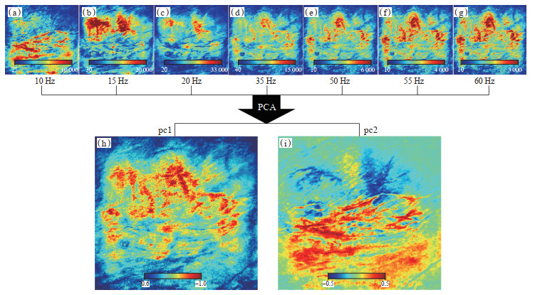 下载原图 图 10 塔里木盆地古城地区GCB2提取自不同分频体的RMS振幅属性(a)—(g)和pc1主因子(h)及pc2主因子(i) Fig. 10 RMS amplitude seismic attributes generated from seven decomposed subvolumes (a-g), and the resulted principal component 1 (h) and principal component 2 (i) in GCB2 Gucheng area, Tarim Basin |