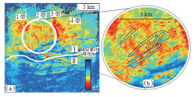 在融合剖面CD上,1带深蓝至绿色、2带红至粉色、3带暗红至蓝色、4带浅蓝至青色。据此判断,2带单层厚度比3带单层厚度大,1带和4带单层厚度较小。在融合切片上,Ⅰ区和Ⅱ区差异明显,可以观察到众多地貌和单层厚度特征。3条白虚线将Ⅱ区分为4个带,与常规振幅切片分带特征基本一致,对应剖面上的1—4带。从融合颜色上判断,1带和4带单层厚度较小,单层厚度较大的2带和3带出现若干北东—南西走向的线状响应,4带也有零星分布,与下寒武统上段时间厚度图有较好对应关系。相比而言,2带内的线状响应呈弯曲状且较密集,4带内的线状响应较平直且更离散。融合颜色表明,线状响应内部单层厚度大于线状响应间,同一条线状响应内不同位置的厚度也略有差异(图 4d)。