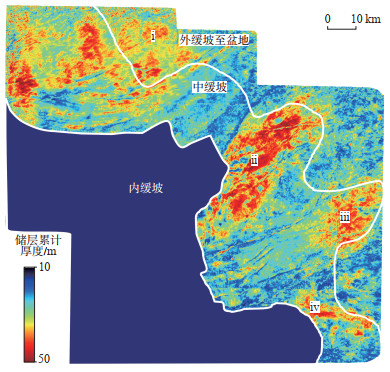 4.2 GCLP储层地震刻画将地震岩性学研究流程应用至GCLP,对获取的7个分频属性进行主因子分析,前2个主因子涵盖总信息的88.46%,其中,60 Hz和10 Hz的RMS振幅属性是最大贡献者(表 2)。利用拟合关系式(1)计算的GCLP储层分布(图 12)显示,该区储层厚度为0~50 m,除西北部的GCB2外,还存在4个储层发育区(ⅰ—ⅳ)。其中,ⅱ—ⅳ区位于中缓坡,ⅰ区位于外缓坡至盆地。从区域上看,ⅱ区储层厚度最大、分布面积最广。