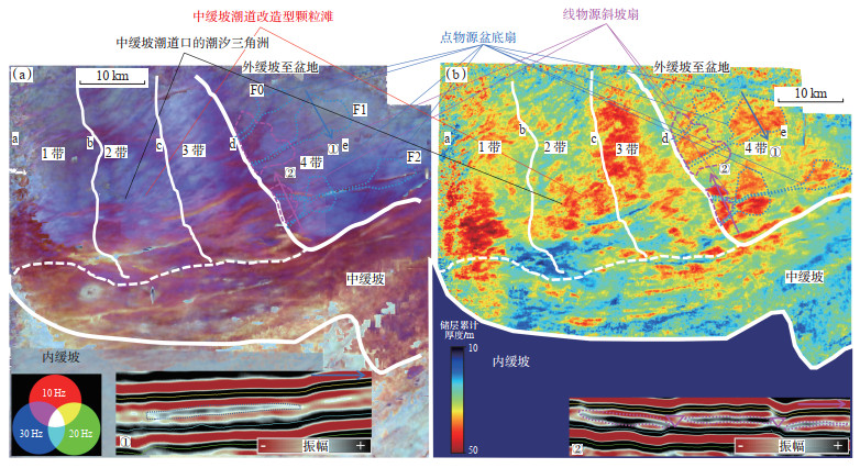 GCLP北部靠近满加尔生烃坳陷,成藏条件有利,优选该区开展中缓坡、外缓坡至盆地的沉积储层研究。地震地貌学定性分析(图 13a)和地震岩性学定量计算(图 13b)有助于我们更好地理解不同类型储层的空间分布。
