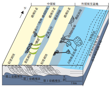 地震沉积学有效预测了古城地区沉积环境和储层分布,结合苏盖特布拉克露头和现代Florida Keys研究,构建了古城地区下寒武统肖尔布拉克组的沉积模式(图 14)。下寒武统发育内缓坡、中缓坡和外缓坡至盆地,形成了台内礁滩体、台缘斜坡扇、盆地盆底扇等有利储层发育区。中缓坡存在3套礁滩体系,其中第2套顶部遭受强烈侵蚀,被南东向洋流产生的近东西向潮道所改造。未被潮道切穿的颗粒滩因暴露而遭风化淋滤,有利于形成岩溶储层,潮道改造促使潮道口处发育潮汐三角洲相颗粒岩。在外缓坡至盆地,线物源斜坡扇和点物源盆底扇均是储层有利发育区,至盆地远端可见深水沉积物波[53-55]。