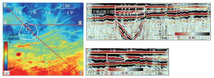 GCB2南部下寒武统上段时间厚度小但分布连续;北部时间厚度大但呈南北向带状分布(1—4带),1带和3带地层厚度小于2带和4带。将地震拉平至下寒武统顶,发现异常加粗波谷顶部存在下切现象。a—e标注下切位置(图 2b),平面厚度图上呈线状展布(图 2a)。根据时间域地震剖面和轮探1井实测速度,估算下切深度为10~60 m。4个分带特征在拉平剖面CD上清晰可见,异常加粗的波谷位于2带,剖面显示地震同相轴呈自西向东的下超特征(图 2c)。
