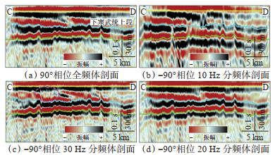 利用小波变换算法将顶拉平的-90°相位数据体分解成3个分频体,主频分别为10 Hz,20 Hz和30 Hz (图 3)。随着主频增加,分频剖面上的异常加粗波谷逐渐变细,在30 Hz分频剖面上分成了2套细波谷,顶部的不连续特征更明显(图 3c中的粉虚线)。鉴于30 Hz分频在5~45 Hz的有效频宽内,地震剖面所揭示的现象真实可靠。