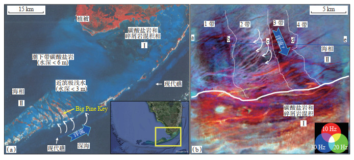 Florida Keys及周缘相关研究为解剖古城地区沉积储层提供借鉴[33-35],在佛罗里达州南部,粗碎屑从北侧注入墨西哥湾[36-37]。受此影响,距离Florida Keys约25 km处的东北部地区形成海陆混积(图 5a中的Ⅰ区),岩性为海相碳酸盐岩和陆源碎屑岩。Florida Keys位于海相区(图 5a中的Ⅱ区),不受陆源碎屑影响。佛罗里达州陆上和Florida Keys之间水深为3~6 m,而墨西哥湾和Florida海峡水体较深,卫星影像可以印证(深蓝色代表深水、浅蓝色代表浅水)。Florida海峡中的洋流呈北东流向,控制形成了切穿Florida Keys的潮道,潮道间是被改造了的更新统颗粒滩,Big Pine Key是其中面积最大的颗粒滩,Key Largo灰岩发生岩溶形成储层。波浪携带更新统碳酸盐岩颗粒滩及其东部现代礁提供的物源,沿现代潮道穿过更新统礁滩复合体,在西侧较浅水区卸载,形成高孔颗粒灰岩。