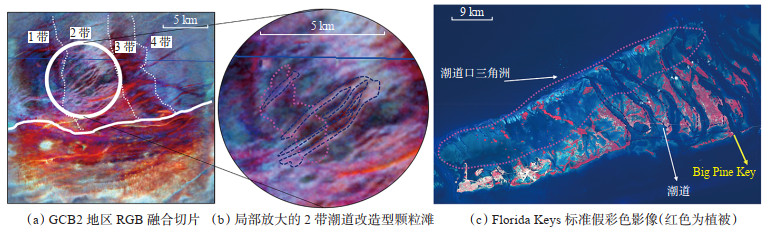 融合切片信息丰富,横向分辨率高于垂向分辨率,这是地震沉积学的优势,有利于沉积相分析。美国佛罗里达州南部Florida Keys (图 5a)与GCB2范围内2带融合切片(图 5b)所揭示的线状响应极为相似。Florida Keys是更新统碳酸盐岩颗粒滩被现代潮道改造而成[31-32],潮道沟通了Florida海峡和Florida湾,Florida海峡中的北东向洋流为潮道提供水动力,使其切穿更新统碳酸盐岩颗粒滩。