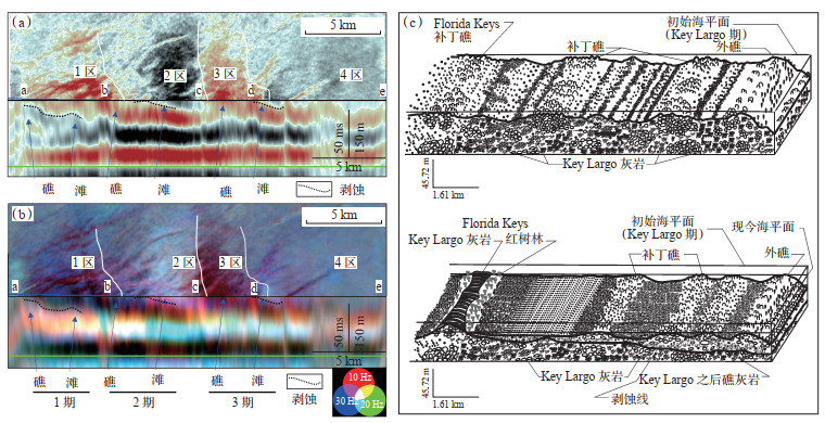 下载原图 图 7 塔里木盆地古城地区GCB2内解释的3套礁滩在振幅体(a),RGB融合体椅状图特征(b)和Florida Keys的2期礁滩体演化(c) (据文献[38]修改) Fig. 7 Evolution of three periods of reef-shoal systems in GCB2 Gucheng area Tarim Basin shown by foldaway view of amplitude (a) and RGB fused data (b), which is inspired by two periods of reef-shoal systems in Florida Keys (c) |