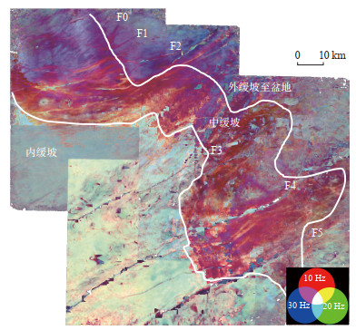 将地震地貌学研究流程应用到GCLP三维,绘制了更大范围的RGB融合平面图(图 8)。尽管连片三维存在一些拼接处理痕迹,但是结合古城地质背景,仍可识别出内缓坡、中缓坡和外缓坡至盆地3种沉积环境。平面图显示5条不同规模的北东向走滑断裂(F0—F5)。除了在GCB2内2带识别的潮道改造型颗粒滩外,在4带及其以东更大范围内,还可以观察到丰富的地质现象。