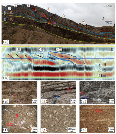 下载原图 图 9 塔里木盆地古城地区GCB2地震剖面与苏盖特布拉克野外露头特征 (a)露头区肖尔布拉克组礁滩体结构;(b)GCB2 地震剖面示肖 尔布拉克组前积反射;(c)—(e)露头区礁滩体厘米级特征;(f)—(h)毫微米级特征。 Fig. 9 Characteristics of seismic profile from GCB2 Gucheng area Tarim Basin and Sugaitebulake outcrop |