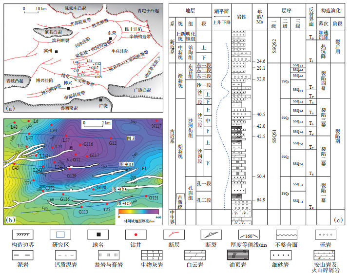 1 地质概况东营凹陷位于渤海湾盆地济阳坳陷的南部,是一个典型的中—新生代断陷盆地。凹陷南邻鲁西隆起,西北与埕宁隆起接壤,内部划分为利津、牛庄、博兴和民丰4个洼陷及北部陡坡带、南部斜坡带和中央隆起带[21-23](图 1a)。梁家楼地区位于草桥—纯化镇鼻状构造带向西北倾没与中央隆起带向西南倾没的交界处,其东部以构造脊线与牛庄洼陷相邻,南部通过纯北断层与纯化古隆起相接,北部接中央隆起带,西北部与利津洼陷相对,西南部与博兴洼陷毗邻[24-25](图 1a)。研究区位于梁家楼东部,整体呈“南高北低”的构造格局,南东部为陈官庄断裂带,北西部为纯化断裂带西翼。该区发育大量E—W走向、NEE—SWW走向的北倾正断层,这些断层组成由南向北呈逐级下降的断阶(图 1b)。
