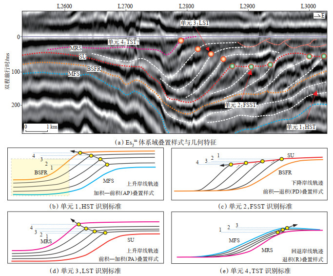 2 层序界面识别基于地震和钻井资料,通过观测地震反射终止关系、坡折点的迁移变化以及地层的叠置关系,对Es3m层序地层格架进行了研究。Es3m内部划分为4个体系域单元,其中单元1在地震剖面上显示地层厚度一致,具有明显的垂向加积叠置的底积层和前积层,未见明显的岸线轨迹。此外,单元1下部的地震反射同相轴振幅强烈,指示了稳定的湖侵泥岩沉积。推断单元1的底界面为最大湖泛面(MFS),判断单元1为HST,其顶界面为BSFR(指FSST底界面)。单元2在地震剖面上表现为进积和退覆叠置特征,具有下降的岸线轨迹,可见高角度前积层,但缺乏顶积层。因此,判断单元2为FSST,其顶、底界面分别为不整合面(SU)和BSFR。单元3的坡折点向盆地方向推进,呈现上凹形态,单元3的内部地层表现为进积—加积(PA)趋势。由此判断,单元3为LST,其顶部以最大湖退面(MRS)为界,底部以SU为界;单元4在地震剖面上可见上超现象,且上超点呈向陆回退的趋势。因此,判断单元4为TST,其顶界面为MFS,底界面为MRS(图 2)。