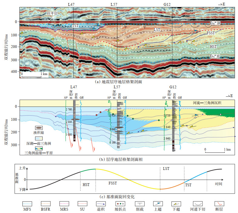研究区的HST位于Es3m的底部,主要由多套近平行的垂向加积叠置的底积层与前积层构成(图 3a)。在研究区东部,HST显示出小规模的前积反射,且地层厚度增加,但未见明显的坡折点。钻井和测井数据显示,该套地层岩性整体由近130 m厚的泥岩、粉砂岩组成,垂向呈加积—进积(AP)地层叠置样式。FSST的底部下超于HST,内部呈切线斜交型前积反射,缺少顶积层和底积层,顶部有削截接触。坡折点持续向下迁移,反映了相对湖平面持续下降,且沉积物快速推进至湖盆中心,形成进积和连续退覆的叠置样式(图 3a)。G12井钻遇FSST的前积层远端,岩性变化表现为反旋回特征(图 3b)。在L57井附近,FSST的地层较薄,发育少量粉砂岩。LST覆盖于FSST之上,具有较大的地层厚度,整体表现为典型的“S”型前积反射,发育顶积层、前积层和底积层,三层结构完整(图 3a)。L57井因钻遇前积层的主体,显示出典型的反旋回特征,顶部地层砂岩较厚,粒度较粗。G12井则钻遇顶积层,岩性以中砂岩为主,测井曲线呈箱形,为一个典型的分流河道沉积。L47井钻遇LST底积,岩性以泥岩为主,内部夹少量的砂岩(图 3b)。TST发育在Es3m的顶部,表现为强振幅、连续性较好的地震相,内部可见明显的上超反射(图 3a)。L47井显示该阶段岩性主体为厚层泥岩,粒度向上变细,指示湖平面快速上升。