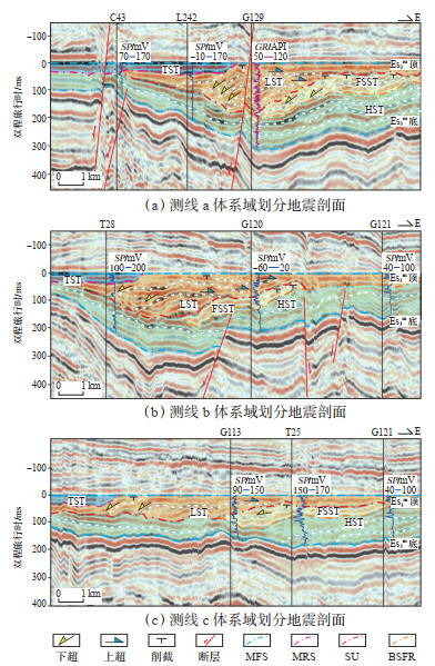 2.2 垂直物源方向层序结构近年来的研究表明,受沉积物供给的侧向差异控制,体系域的地层叠置样式和界面特征等会发生变化,其垂向叠置规律和地层结构并不是完全符合标准的层序模式[27-31]。尽管研究区Es3m层序演化特征在顺物源剖面上具有较好的规律性,但在侧物源方向,体系域特征存在明显的变化(图 4)。在地震剖面上,HST的同相轴较平缓,进积和加积特征不明显。HST的主体位于测线b处,地层厚度向南、北两侧逐渐减小(图 4)。FSST的地层厚度在测线a附近最大,具有高角度前积层且缺失顶积层,表明该区域为沉积的主要位置。南部测线显示,FSST厚度减小,前积层变得平缓,表明该区域远离沉积物供给主体(图 4)。LST在东部各测线均具有明显的顶积层和前积层。测线a的LST地层厚度最大,可见高角度的前积层(图 4a)。测线b的特征与测线a相似,但前积倾角略微减小(图 4b)。测线c的地层厚度最小,前积层的倾角最为平缓(图 4c)。这一现象表明,LST三角洲的沉积主体仍集中在测线a附近。TST发育于Es3m的顶部,测线a的TST向陆超覆范围最广,而在南部的超覆范围减小(图 4)。测井资料显示,测线a的TST对应SP测井曲线显示相对高值,含泥量较多;而在测线b,SP测井曲线相对较低,显示出较高的含砂量(图 4a,4b)。以上现象指示TST的沉积主体位于测线a附近。