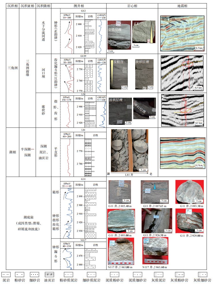 3 沉积相展布特征 3.1 沉积相类型通过分析测井和地震资料,结合以往岩心资料,认为研究区以三角洲相和湖泊相为主,并进一步识别出三角洲前缘亚相、半深湖—深湖亚相、湖底扇沉积。