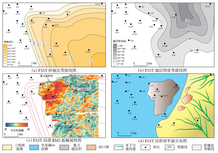 3.2 沉积相平面展布通过统计地层厚度和砂地比等数据,并提取Es3m体系域内部层间振幅属性切片,分析沉积物从FSST到LST的沉积演化过程。
