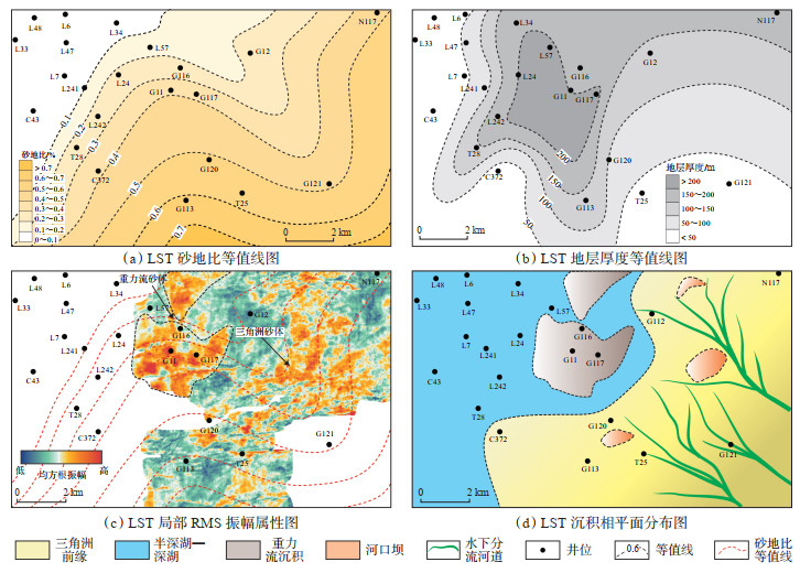 在FSST沉积时期,G12井附近的地层厚度最大,G121井附近的砂地比最大,并向NW逐渐递减,表明物源由SE逐渐向NW推进。通过地震属性约束砂岩边界,强振幅属性圈定的区域通常代表砂岩更发育的区域。结合前期钻井和测井分析,FSST主要发育水下分流河道、河口坝和重力流沉积。其中,三角洲前缘位于G113井一带,呈NE—SW向展布,而重力流沉积位于G12—G117—L57井一带(图 6)。在LST沉积时期,地层厚度自东向西呈“薄—厚—薄”的分布规律,沉积中心位于G117—G11—L24井附近,该区域为前积反射的主体区。G121井、G113井附近的砂地比最大,并向NW向递减(图 7a,7b)。LST沉积相仍以三角洲前缘的水下分流河道和河口坝为主,并发育少量的重力流沉积(图 7c,7d)。对比FSST和LST,可以发现LST的高含砂率区域相比FSST向盆地方向迁移,沉积中心也由FSST时期的G12井附近向LST时期的G11井附近西移。LST的沉积类型与FSST类似,但三角洲体系向盆地推进更远,与层序格架的认识一致。