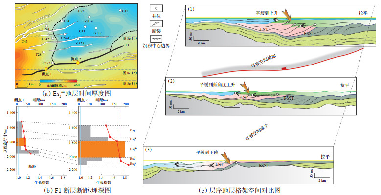 在研究区内,体系域的结构在侧向上表现出微弱差异,这种差异主要受陈官庄断裂带F1活动的控制。F1断裂的断距-埋深和生长指数显示,在Es3m沉积时期,F1断裂活动性最强,中部断裂的生长指数达1.8,断距达到最大值(图 8a,8b)。在G117井一带,FSST和LST的地层厚度及砂地比最大,反映了F1断裂对沉积中心的控制(图 6、图 7)。此外,F1断裂作为该区的三级断层,在其上盘高沉降、高可容纳空间的区域,Es3m内部发育完整的HST,FSST,LST和TST[图 8c(1)]。然而在F1断裂下盘的低沉降、低可容纳空间区域,HST和LST厚度明显减小。相较于图 8c(1)来说,LST表现出更低的岸线轨迹[图 8c(2)]。在最南部测线中,HST,FSST,LST和TST发育程度最差,因可容纳空间有限,地层厚度薄,体系域识别更加困难。FSST和LST表现为薄层,岸线轨迹从平缓到弱下降[图 8c(3)]。